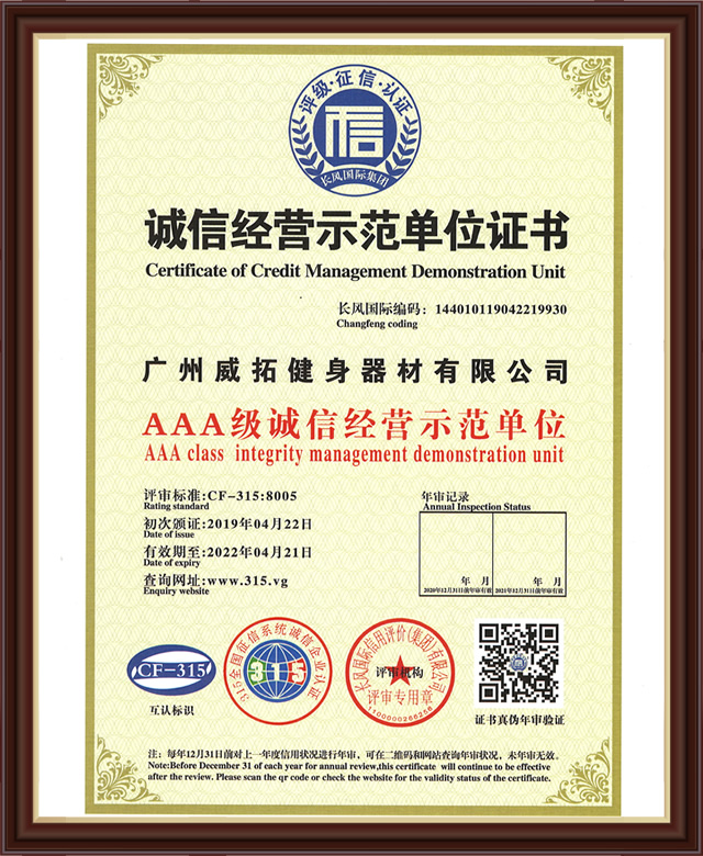 诚信经营示范单位证书